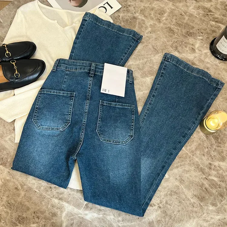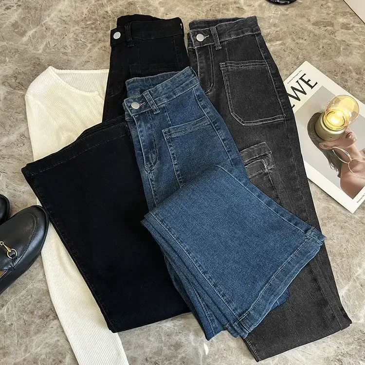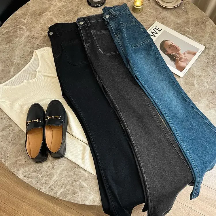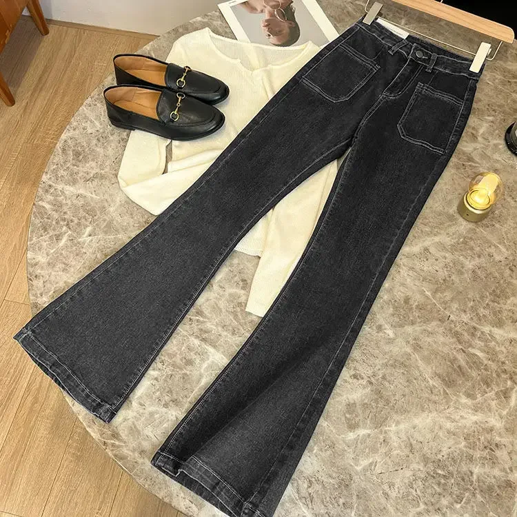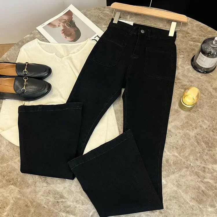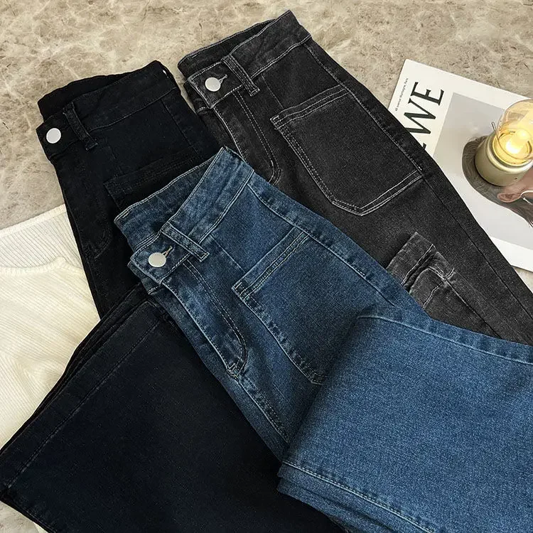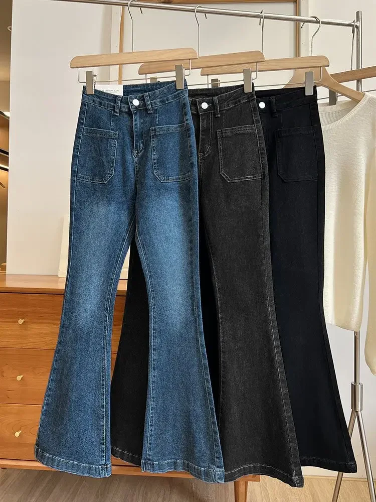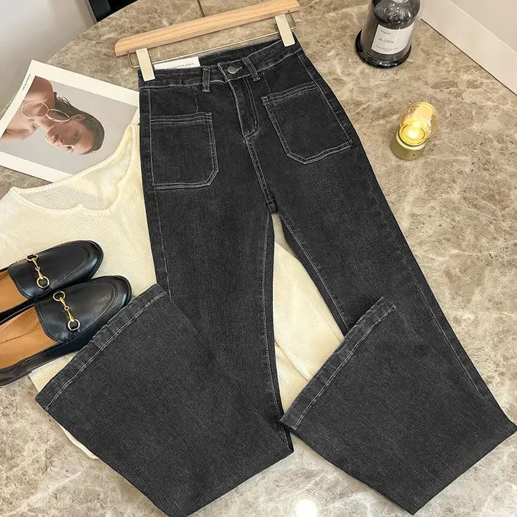 ZMZBCH High Waist Trousers Loose Washed Jeans Pockets Slim Denim Flare Classic Women Vintage Stretch Straight Trousers All-match